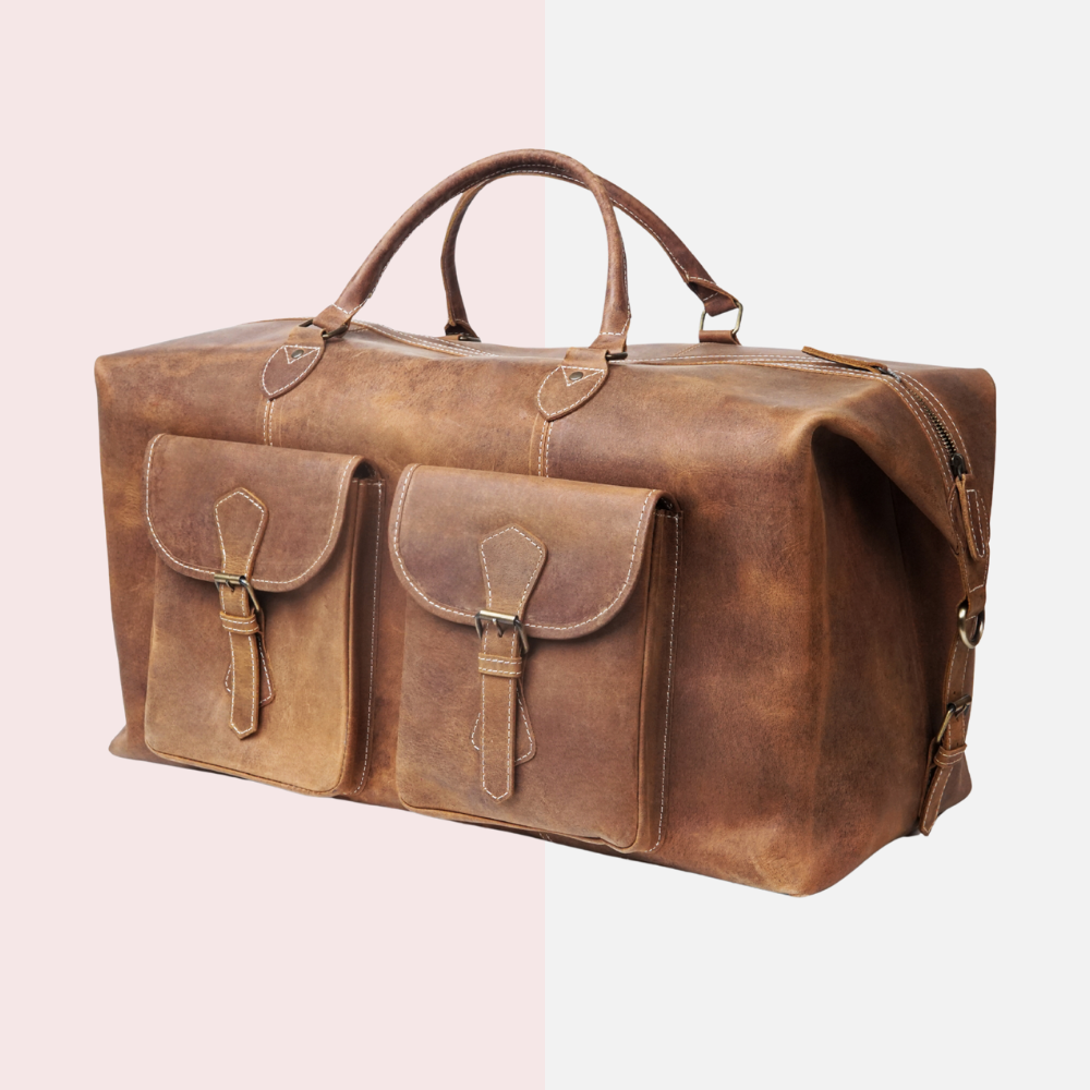 The Cognac Brown Vintage Leather Duffle Bag is a timeless blend of classic design and modern functionality. Inspired by 19th-century expedition luggage, this robust cowhide leather weekender is perfect for trips up to 5 days. With two exterior cargo pockets, a back zip compartment, and a spacious expandable interior, it combines practicality with vintage charm.